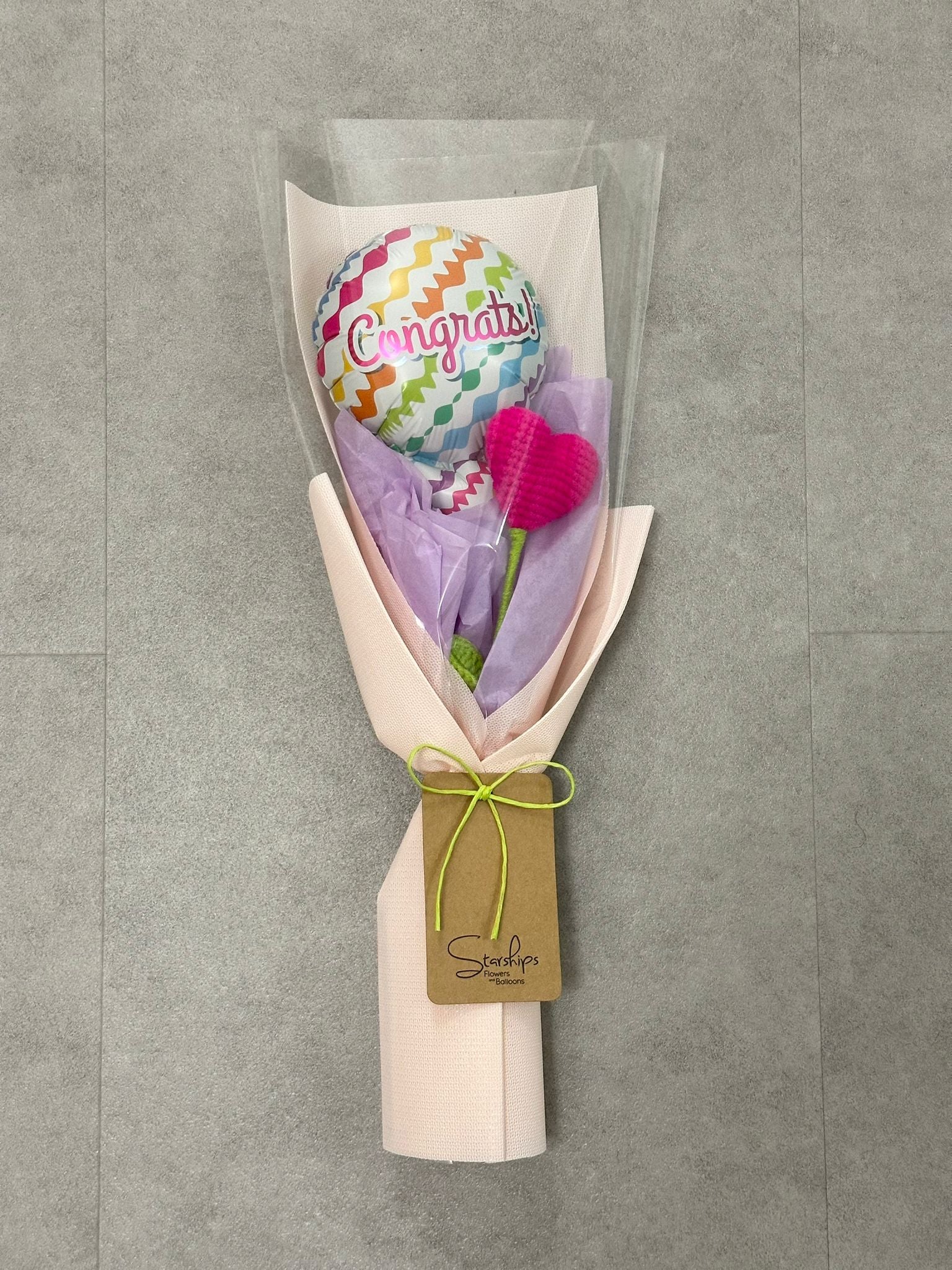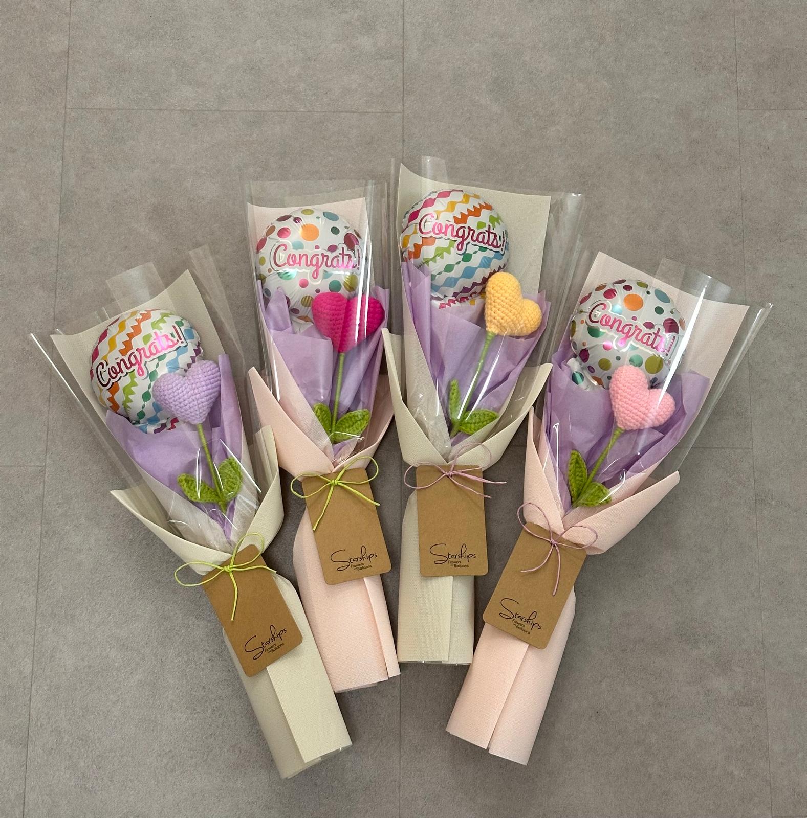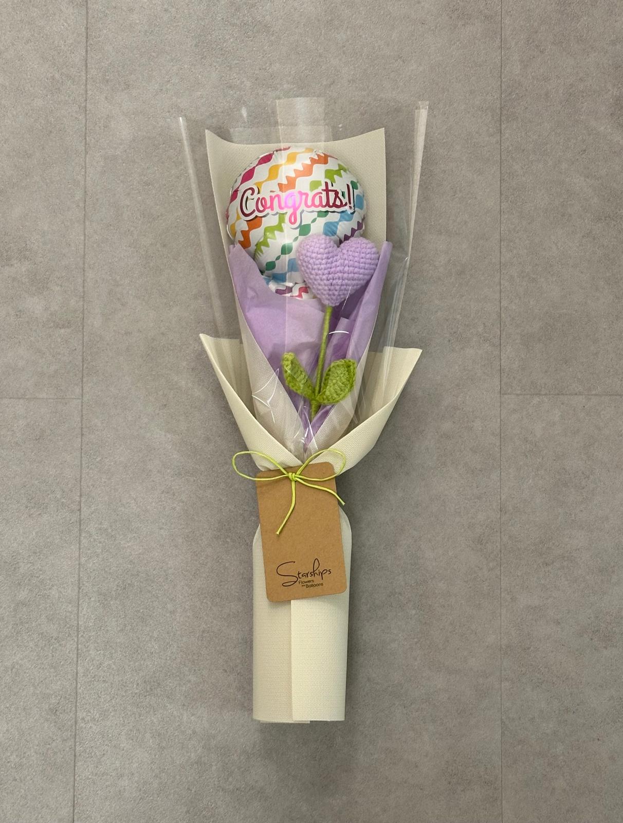 Crochet: Heart + Congrats Foil Balloon x 1 Comes with wrapper and a free blank greeting card.