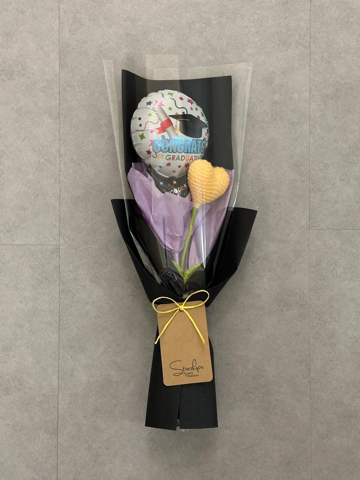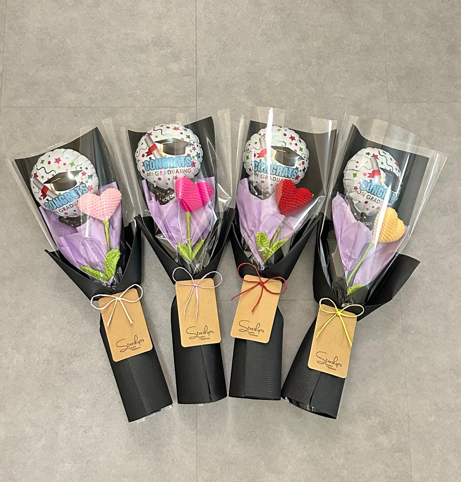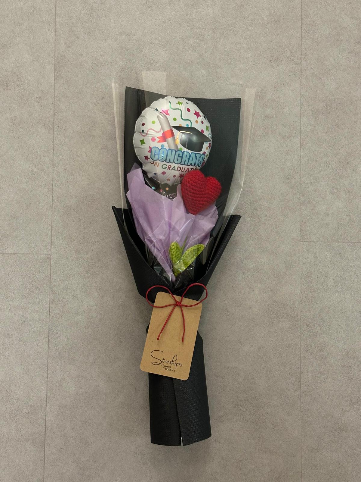 Crochet: Heart + Graduation Foil Balloon x 1 Comes with wrapper and a free blank greeting card.