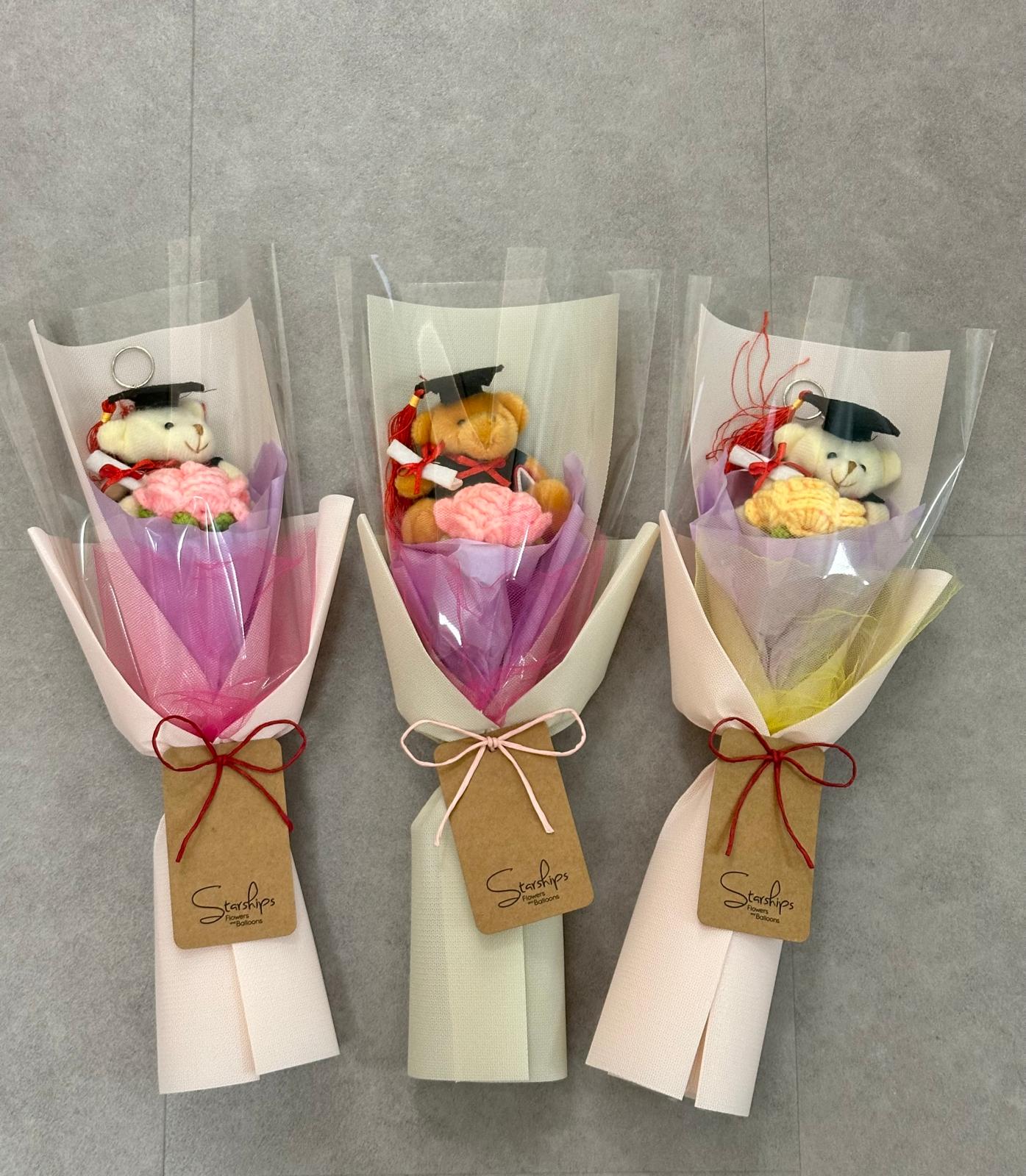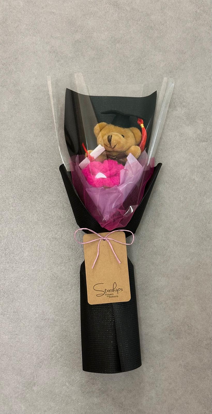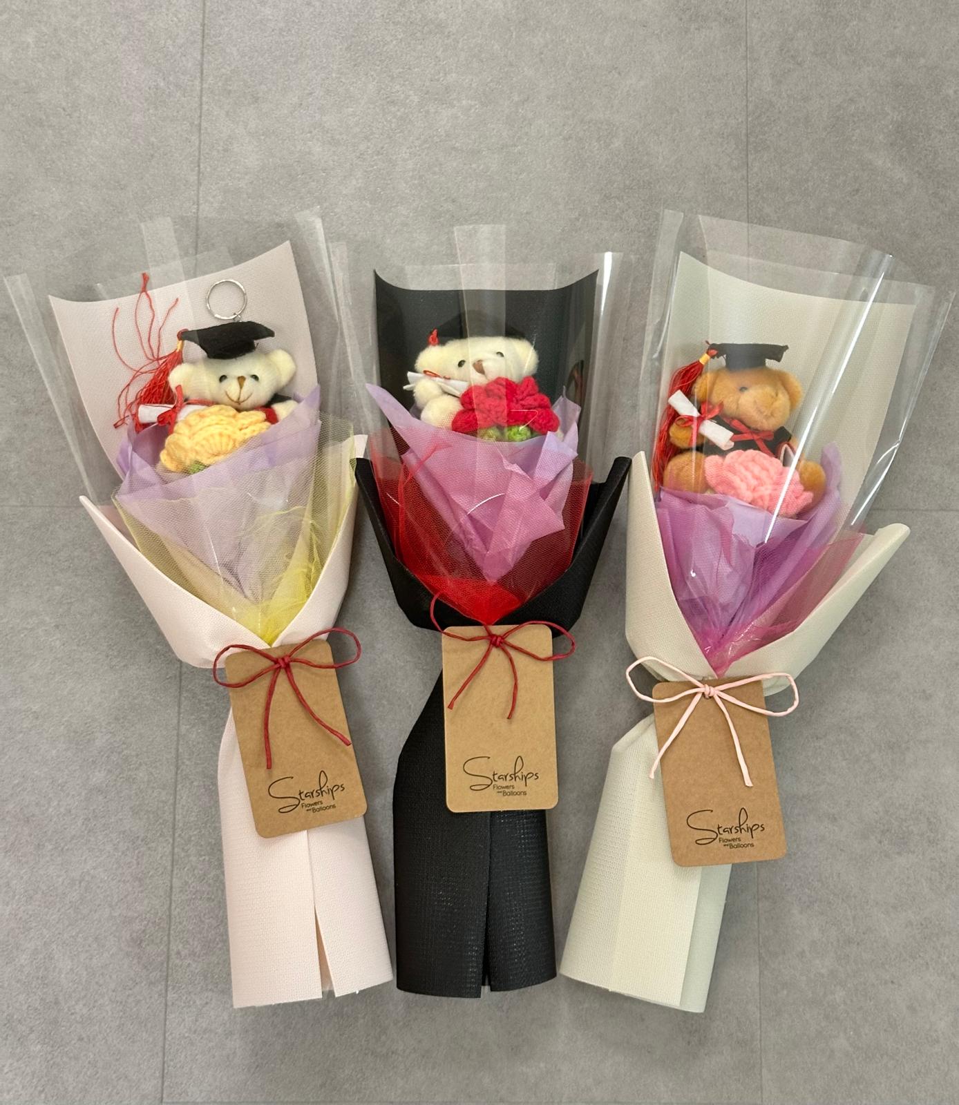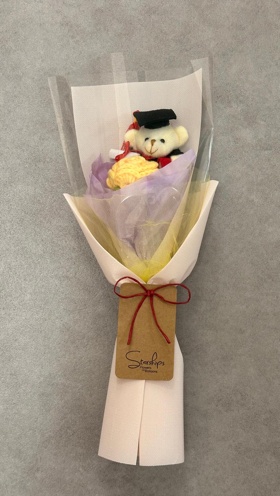 Graduation Bear x1, Crochet Rose x 1 Comes with wrapper and a free blank greeting card.